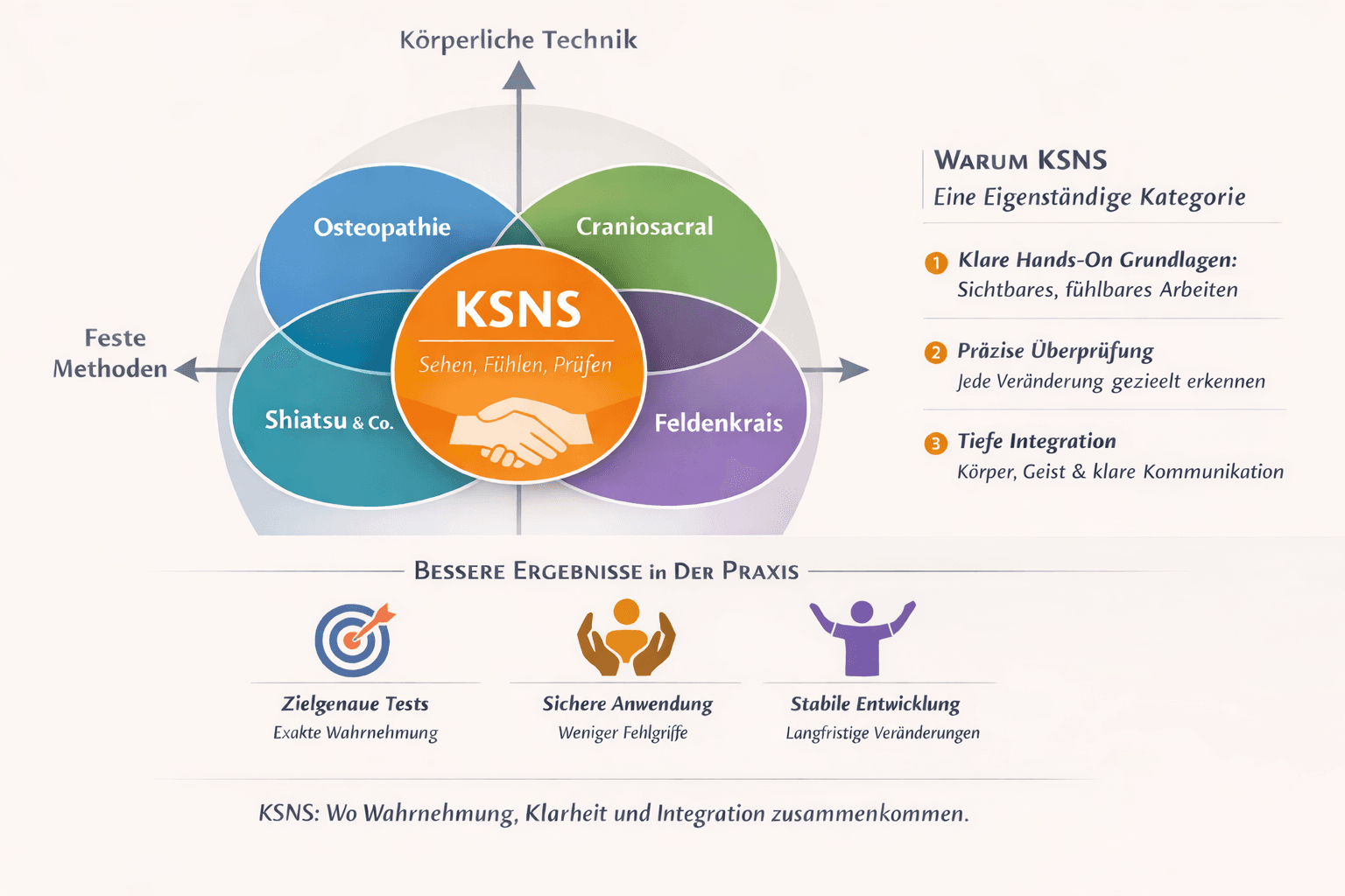 Im Rahmen der KSNS-Methode arbeiten wir mit den eigenentwickelten Strukturverfahren SBON und SDO. Diese dienen der funktionellen Analyse und Regulation und sind nicht als medizinische Heilbehandlung zu verstehen. Bestehende oder vermutete Erkrankungen sind ärztlich abzuklären und entsprechend betreuen zu lassen.